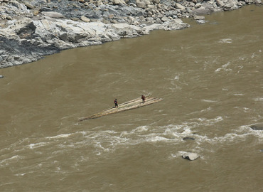 सुनसरीको वराहक्षेत्र नगरपालिका–१ स्थित सप्तकोशी नदीमा बाँसको चेफामा बसेर पानीको बहावसँगसँगै यात्रा गरिरहेका किसान। भोजपुर, उद ...